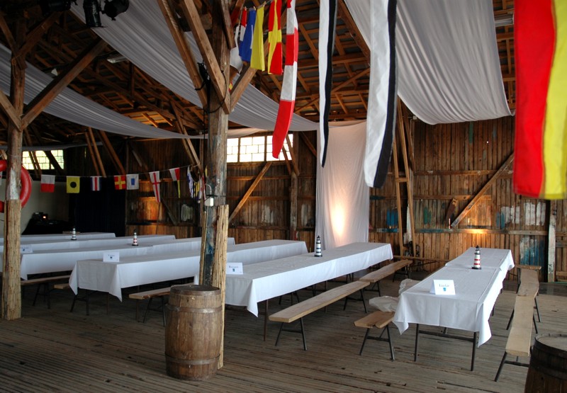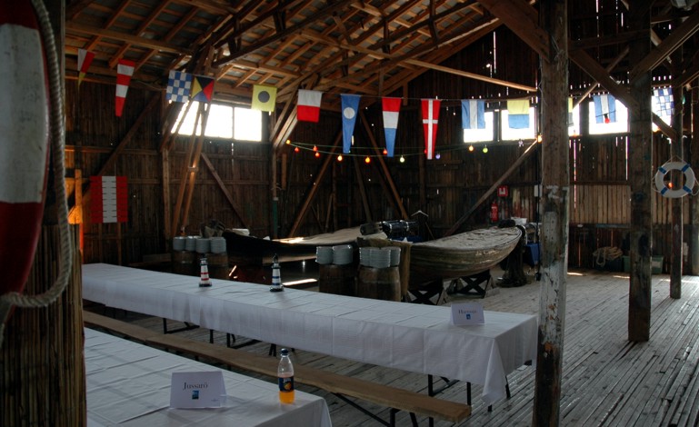GALLERIA 'Valkosaari' Juhlatilana on punainen wanha telakkarakennus ylimmän kuvan aivan vasemmassa laidassa. Juhlatilan koko on noin 600+ m2. Vanerinen tanssilattiatila on alaltaan n. 45 m2 (9x5 metriä). Meren puolella, kohti Kruunuvuorenselkää, on hiekkakenttämäistä piha-aluetta, jolla on järjestetty iltaisin jopa näyttäviä "tuli-show"-esityksiä ym. ohjelmaa. Juhlissa tilan vakiosomistukseen kuuluvat mm. pöytäliinat pöydissä, valmiiksi katetut pöydät, purjekankaat, värikkäät juhlaliputussiimat, "tarjoiluveneet" noutopöydille, ja esimerkiksi pienet majakkasomisteet. Alla olevissa kuvissa on näkyvillä tapahtumakohtaisia, erityylisiä järjestelyjä, kalustuksia, kattauksia sekä esiintymisjärjestelyjä (esimerkiksi esiintymislaitteet bändille järjestetyt eri sopimuksesta). Valkosaaren wanhan telakan tiloihin saadaan istuvalle illalliselle pöytien ääreen enintään 250 vierasta. Mikäli henkilömäärä on pieni, voidaan osa tilasta rajata purjeilla pienemmäksi, sopivan tunnelman luomiseksi. Cocktail-tyyppisiin tilaisuuksiin tila soveltuu noin 350 vieraalle. |