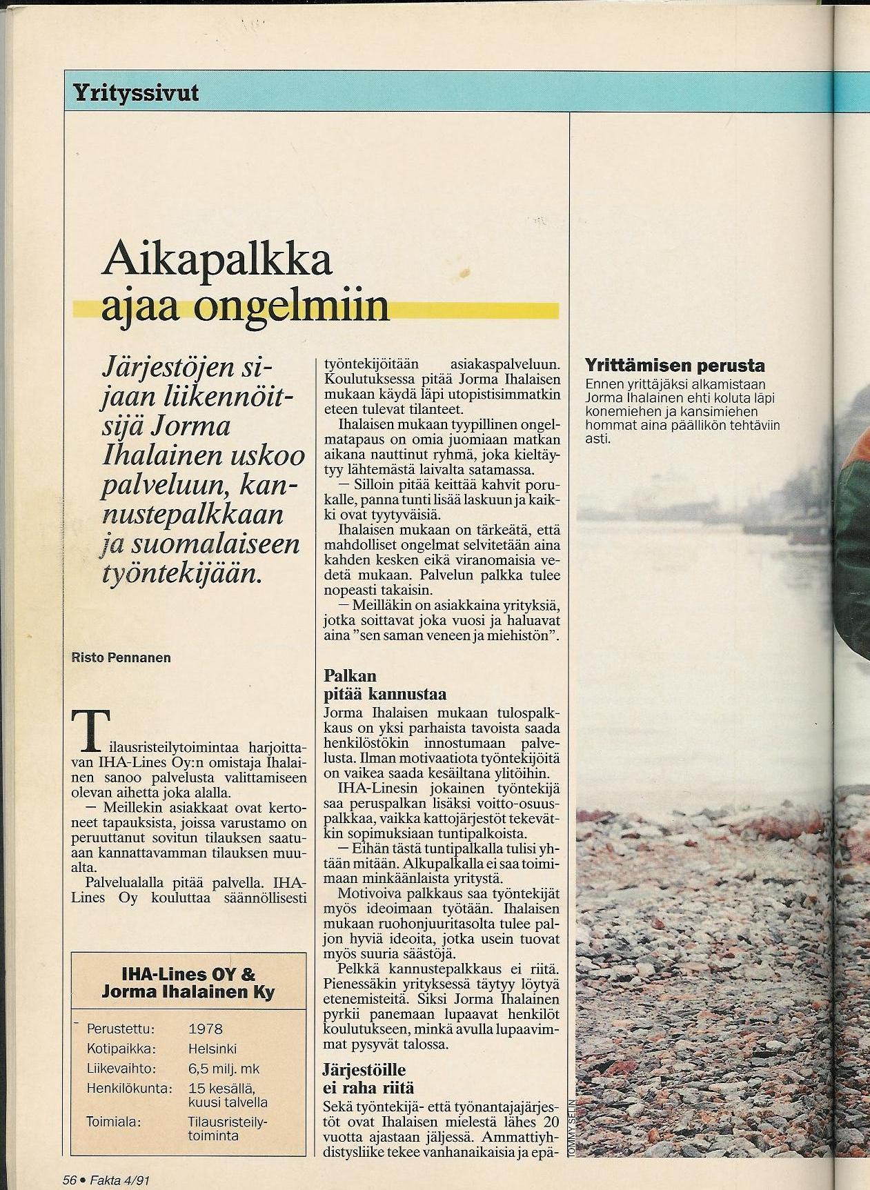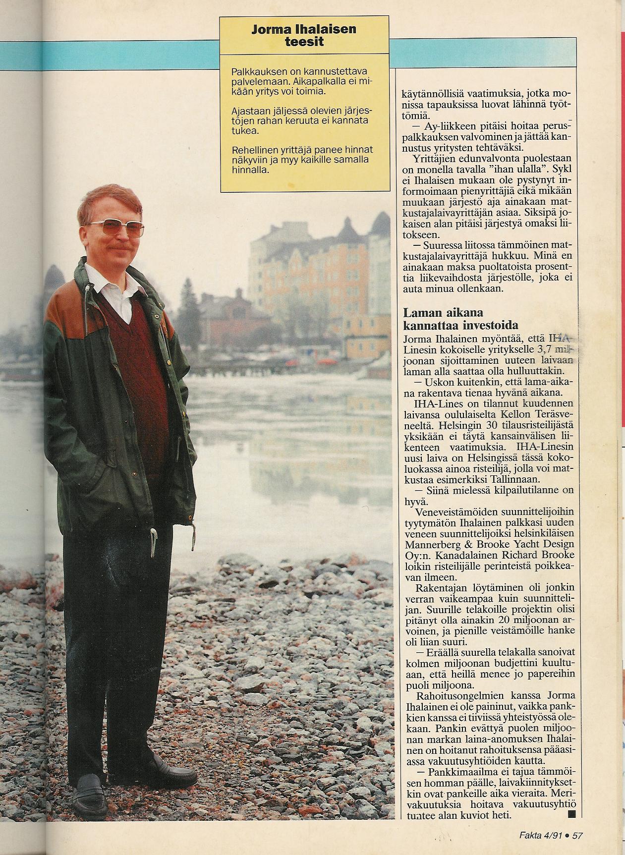 Talouslehti Fakta haastatteli liikennöitsijä Jorma Ihalaista 1991, jolloin yhtiö oli tilannut Mannerberg & Brooke Yacht Design Oy:n suunnitteleman, aivan uudenlaisen m/s Doris -laivan suomalaiselta Kellon Teräsveneeltä. Yhtiön tuleva lippulaiva, suuri investointi, oli [ja oli edelleen vuonna 2009!] kokoluokassaan ainoa kansainvälisen liikenteen luokitukset täyttävä tilausristeilyalus Helsingissä (korkea SOLAS-luokitus). Laivahanke oli kunnianhimoinen ja valmistuva alus edusti aivan uutta laivasukupolvea. Haastattelussa yrittäjän teesejä olivat muiden muassa hyvä palvelu, kannustava palkkaus ja lupaavimpien henkilöiden lisäkouluttaminen ja avainhenkilöstön pysyminen yhtiössä. Liikennöitsijä uskoi myös, että laman aikana rakentava tienaa hyvänä aikana. Suuren Doris-laivan valmistuttua yhtiö laajensikin liiketoimintaansa ja aloitti säännölliset maisema-, lounas- ja illallisristeilyt Helsingin Kauppatorilta.