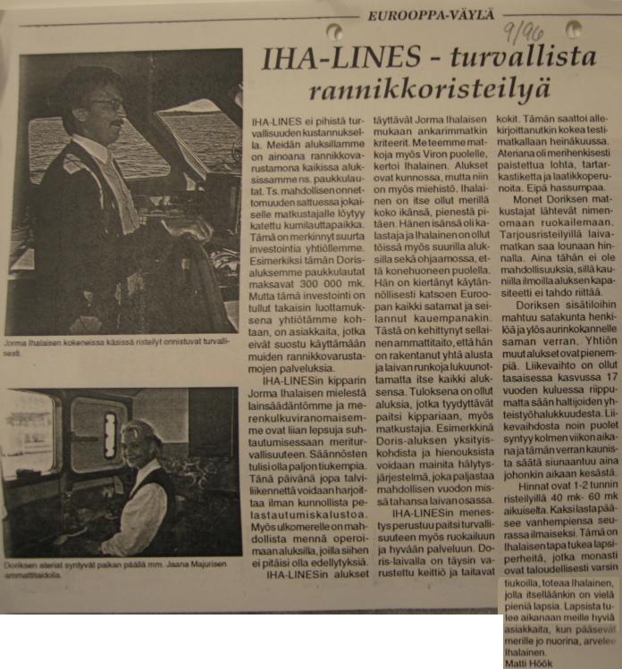 Jo nostalgisiakin piirteitä saava Eurooppa-väylä-lehden artikkeli toi esille turvallisuusnäkökohtia ja kertoi muiden muassa että "Doriksen ateriat syntyvät paikan päällä mm. Jaana Majurisen ammattitaidolla". Toimittajan heinäkuisella testimatkalla oli ateriana ollut "merihenkisesti paistettua lohta, tartar-kastiketta ja laatikkoperunoita".