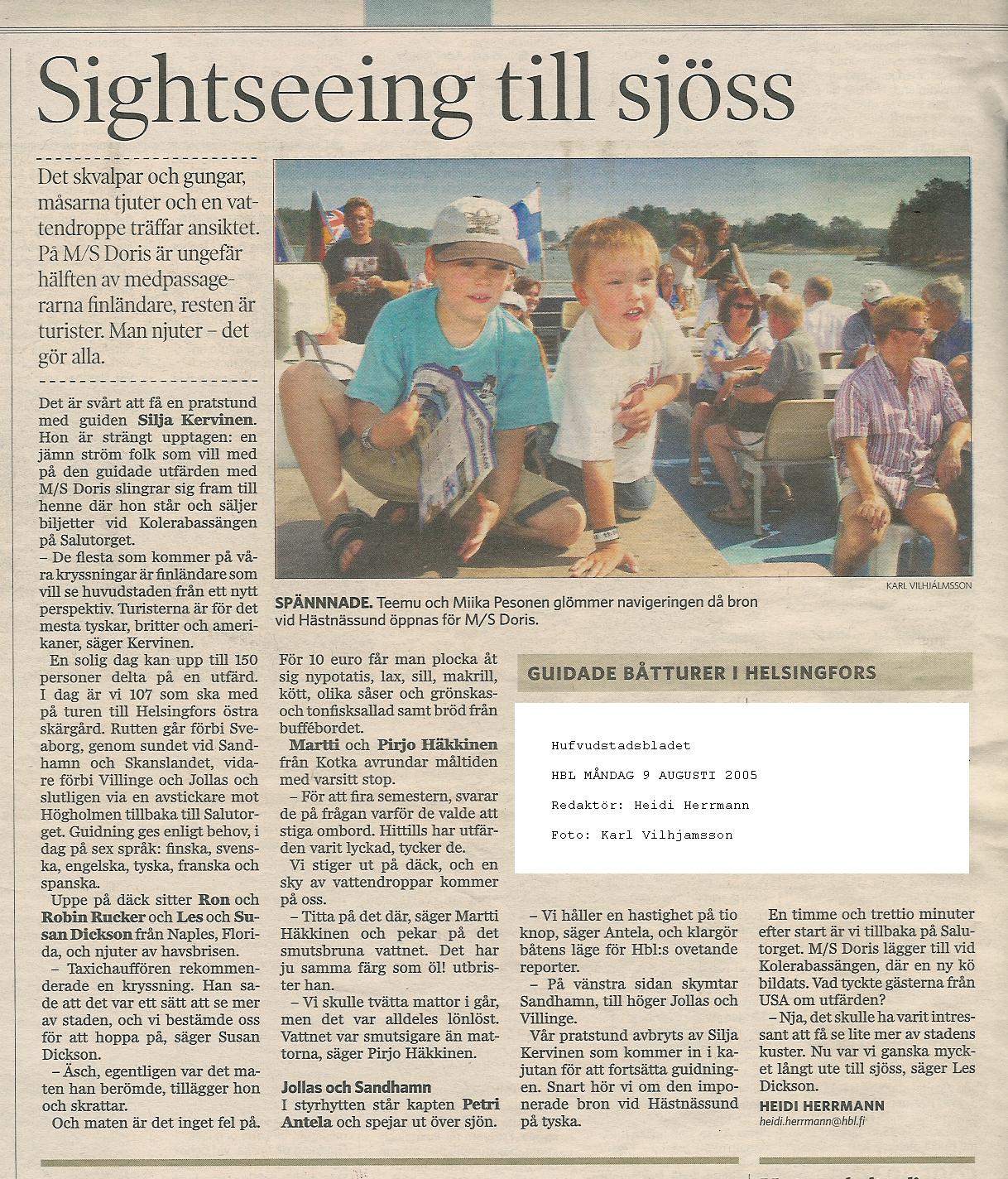 Hufvudstadsbladetin toimittaja ja valokuvaaja olivat tehneet m/s Doris -laivan Ihana Itäsaaristo -risteilyn. Kesäisenä päivänä risteilyllä nautittiin paitsi maisemista, myös kansainvälisestä tunnelmasta ja merilounaspöydän antimista. Floridalaiset Ruckerit ja Dicksonit kertoivat, että taksinkuljettaja oli suositellut risteilyä. Tärkeä kokeneiden matkailijoiden tietämä totuus meinasi melkein unohtua, mutta Susan Dickinson muisti kuitenkin lisätä, että "egentiligen var det maten han berömde, tillägger hon och skrattar" - taksinkuljettajat tietävät parhaat ruokapaikat!