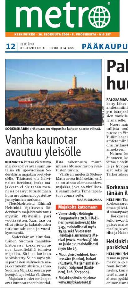 Metro-lehden ennakkouutinen kansainvälisestä majakkapäivästä kertoi harvinaisista yleisöretkistä Porvoon ulkosaaristossa sijaitsevalle Söderskärin majakkasaarelle.