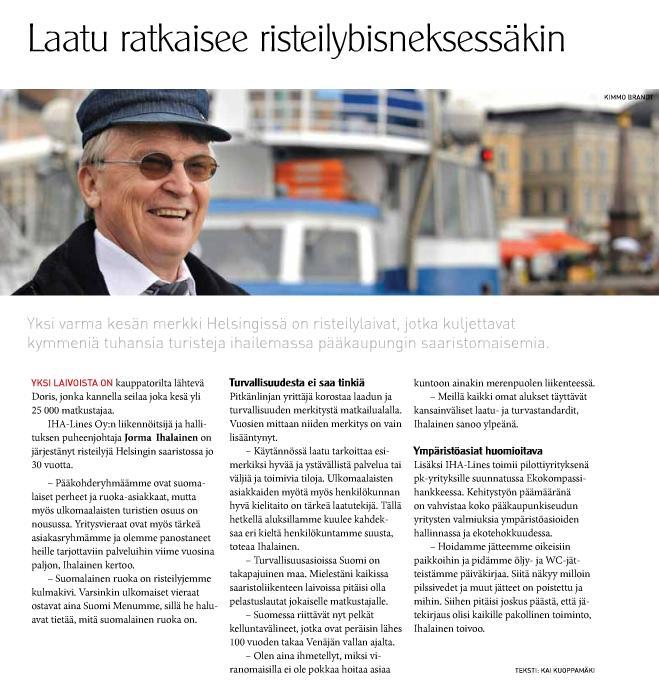 Kauppakamarin jäsenlehdessä olleessa artikkelissa aiheina olivat mm. suomalainen ruoka, laatu- ja turvallisuusnäkökohdat sekä pilottivaiheessa ollut Ekokompassi-ympäristöjärjestelmähanke.
