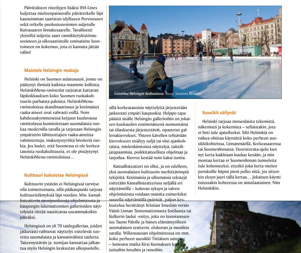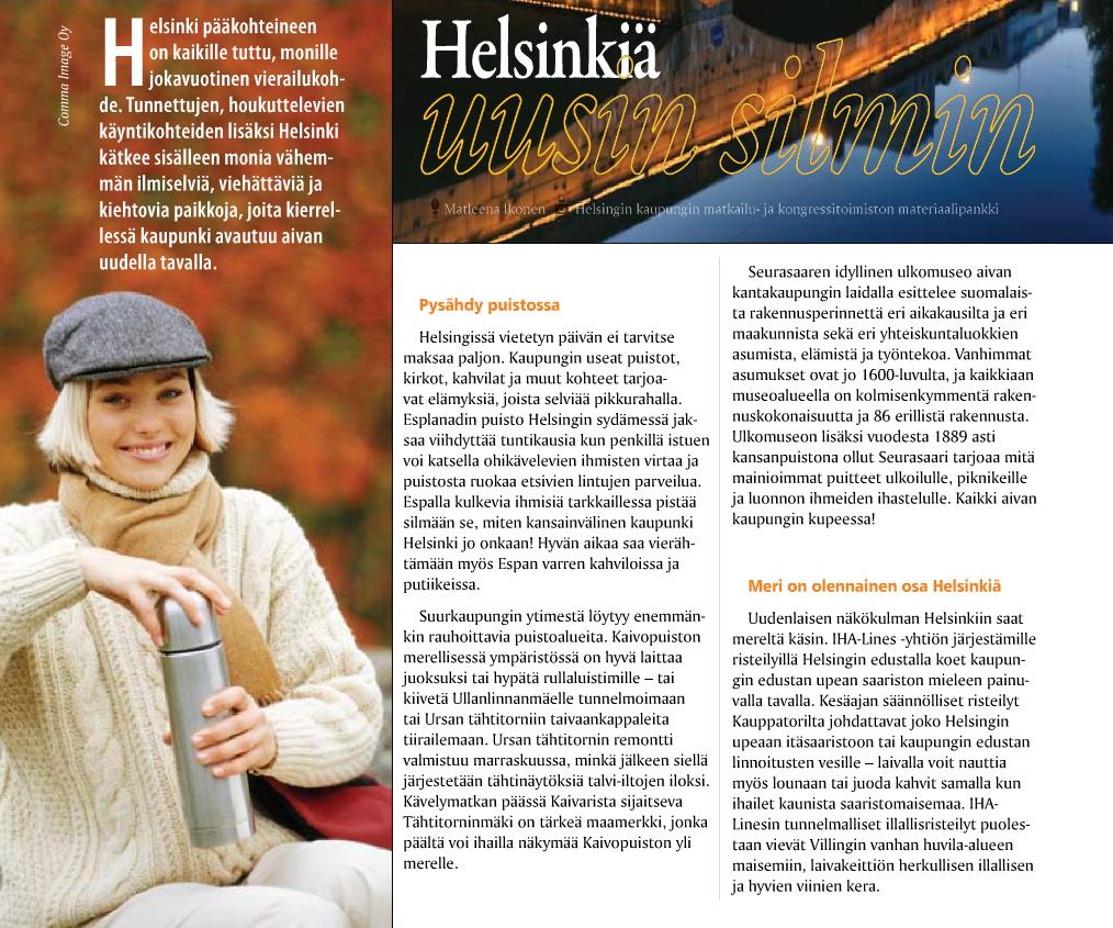 Matkailualan erikoislehti yllytti katsomaan "Helsinkiä uusin silmin". Artikkelissa todettiin että "Helsinki kätkee sisälleen monia vähemmän ilmiselviä, viehättäviä ja kiehtovia paikkoja", joiden avulla kaupunki avautuu aivan uudella tavalla. Helsinkiä monelta kantilta esittelevä juttu kertoi myös IHA-Linesin erilaisista risteilyistä ja merestä osana Helsinkiä.