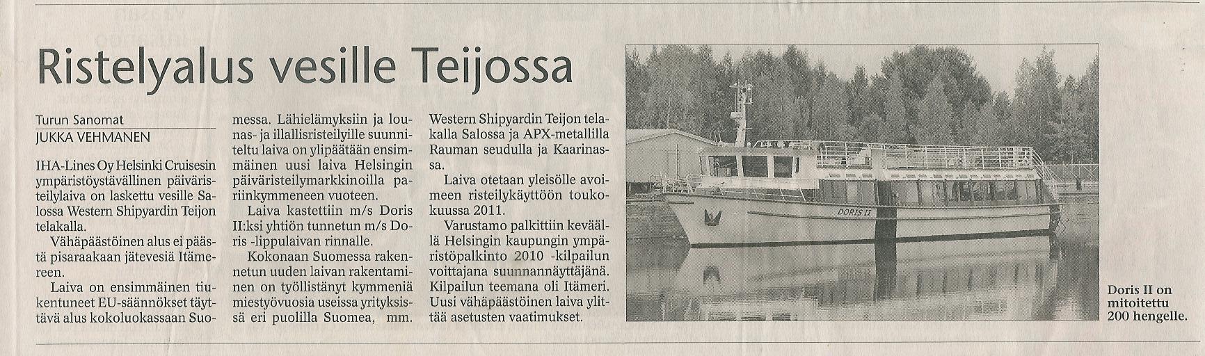 Turun Sanomat 2.9.2010 Turun Sanomat uutisoi IHA-Lines Oy Helsinki Cruisesin uuden risteilylaivan vesillelaskusta talousuutisissa.