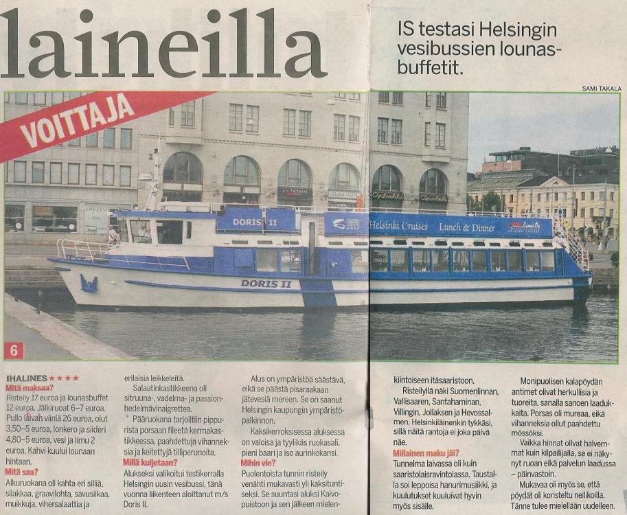 Iltasanomien toimitus teki yllätysvertailun paikallisristeilylaivojen lounasbuffeteista Helsingissä. Testin voittaja oli IHA-Lines. 'Monipuolisen kalapöydän antimet olivat herkullisia ja tuoreita, sanalla sanoen laadukkaita', summattiin artikkelissa. m/s Doris II -laivan ruokasalia kuvailtiin valoisaksi ja tyylikkääksi. 'Tunnelma laivalla oli kuin saaristolaisravintolassa'.