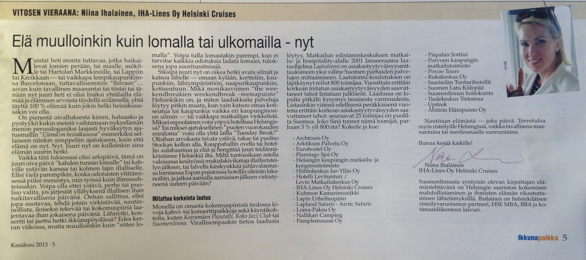 Matkailualan uutislehti Ikkunapaikan päätoimittaja tilasi kolumnin kesäkuun numeroon, vierailevan kolumnistin palstalle. Vitosen vieras -jutun aiheena oli lähellä koteja olevat elämykset myös ihan tavallisina päivinä sekä matkailu- ja hospitality-alan laatujärjestemä Laatutonnin mittauksista selvinneet tutkimustulokset maan parhaista toimijoista. "Joko Sinä tunnet nämä toimijat, parhaan 3 % yli 800:sta? Kokeile ja koe:"